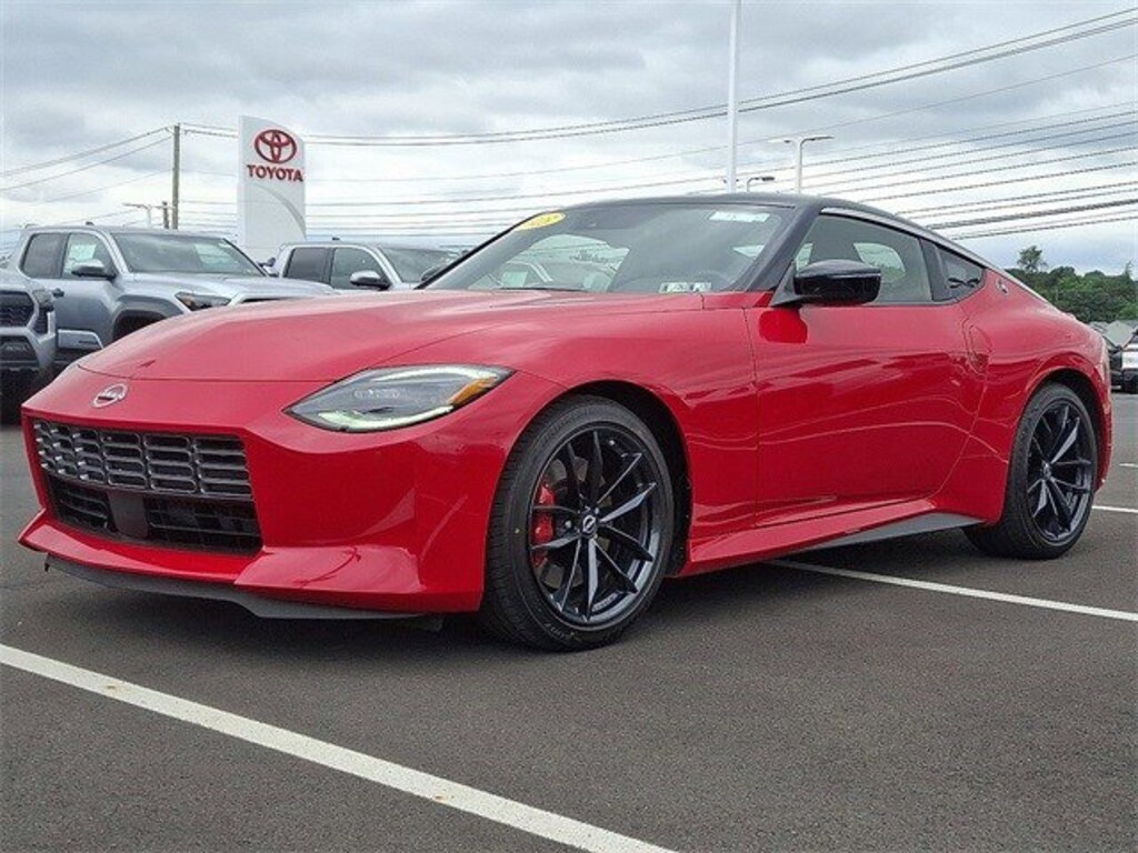 Recent Arrival! Certified. 2025 Nissan Z Performance Solid Red/Super Black *Schedule a test Drive at your home or office*, Nissan Certified Certified, 4-Wheel Disc Brakes, 8 Speakers, ABS brakes, Air Conditioning, Alloy wheels, AM/FM radio: SiriusXM, Auto High-beam Headlights, Auto-dimming Rear-View mirror, Automatic temperature control, Blind Spot Warning, Brake assist, Bumpers: body-color, Compass, Delay-off headlights, Driver door bin, Driver vanity mirror, Dual front impact airbags, Dual front side impact airbags, Electronic Stability Control, Emergency communication system: NissanConnect Services, Four wheel independent suspension, Front anti-roll bar, Front Bucket Seats, Front Center Armrest, Front reading lights, Fully automatic headlights, Garage door transmitter, Heated door mirrors, Heated Front Bucket Seats, Heated front seats, Leather Shift Knob, Leather steering wheel, Leather-Appointed Seat Trim, Low tire pressure warning, Navigation system: NissanConnect with Navigation and Services, Occupant sensing airbag, Outside temperature display, Overhead airbag, Panic alarm, Passenger door bin, Passenger vanity mirror, Power door mirrors, Power driver seat, Power passenger seat, Power steering, Power windows, Radio data system, Radio: Bose Audio System w/8 Speakers, Rear anti-roll bar, Rear window defroster, Remote keyless entry, Security system, Speed control, Speed-sensing steering, Spoiler, Steering wheel mounted audio controls, SynchroRev Match, Tachometer, Telescoping steering wheel, Tilt steering wheel, Traction control, Trip computer, Turn signal indicator mirrors, Variably intermittent wipers, Voltmeter, Wheels: 19" RAYS Super-Lightweight Forged Alloy.