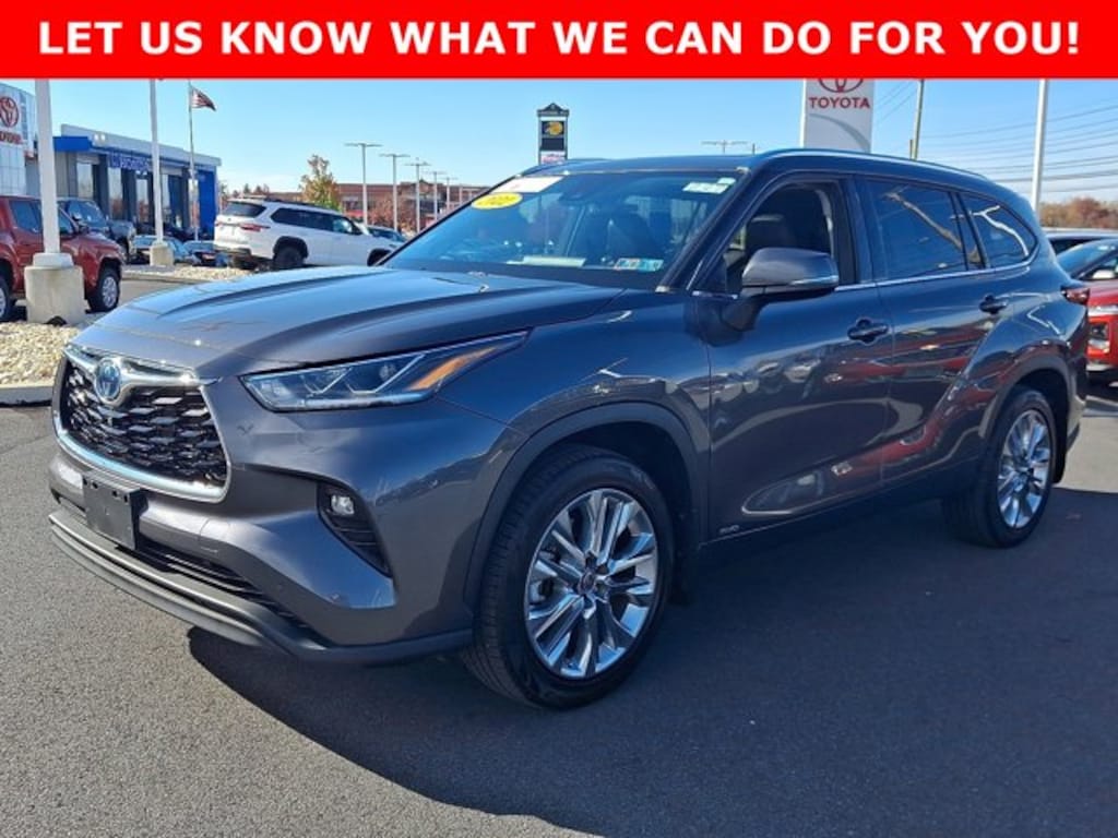 CARFAX One-Owner, Non-Smoker, 2.5L I4 PDI Hybrid DOHC 16V LEV3-SULEV30 186hp, 20" Chrome Wheels, 4-Wheel Disc Brakes, ABS brakes, Active Cruise Control, Apple CarPlay/Android Auto, Auto High-beam Headlights, Birds Eye View w/12.3" Screen, Dual front impact airbags, Emergency communication system: Safety Connect with 1-year trial, Exterior Parking Camera Rear, Front anti-roll bar, Front dual zone A/C, Fully automatic headlights, Garage door transmitter: HomeLink, Heated Front Bucket Seats, Heated steering wheel, Illuminated entry, Knee airbag, Low tire pressure warning, Memory seat, Navigation system: Dynamic Navigation (3-year trial), Occupant sensing airbag, Outside temperature display, Panoramic View Monitor, Power driver seat, Power Liftgate, Power moonroof, Radio: JBL Premium Audio w/12.3" Touchscreen, Rear air conditioning, Remote keyless entry, Steering wheel mounted audio controls, Telescoping steering wheel, Tilt steering wheel, Turn signal indicator mirrors, Ventilated front seats. CARFAX One-Owner. Certified.Magnetic Gray Metallic 2022 Toyota Highlander Hybrid Limited CERTIFIED AWD eCVT 2.5L I4 PDI Hybrid DOHC 16V LEV3-SULEV30 186hpOdometer is 3046 miles below market average! 35/34 City/Highway MPG