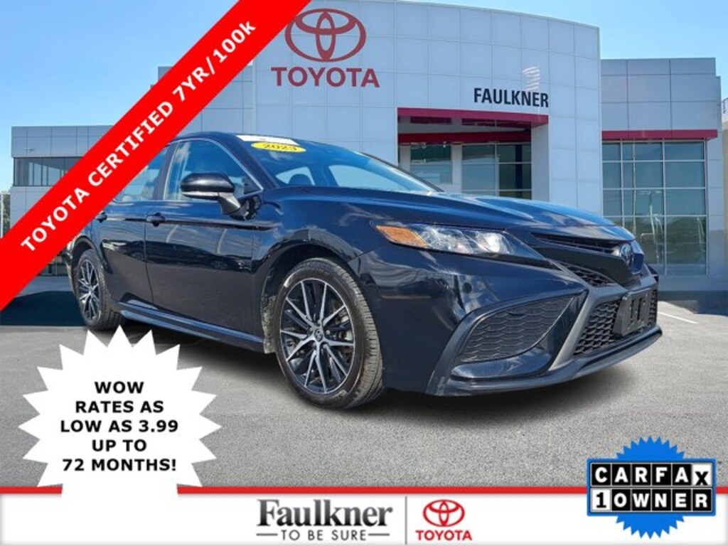 CARFAX One-Owner, Non-Smoker, Black w/Sport SofTex Seat Trim w/Fabric Inserts, 4-Wheel Disc Brakes, 8.0J x 18" Alloy Wheels, ABS brakes, Active Cruise Control, AM/FM radio: SiriusXM, Apple CarPlay/Android Auto, Dual front impact airbags, Dual front side impact airbags, Electronic Stability Control, Emergency communication system: Safety Connect (1-year trial), Exterior Parking Camera Rear, Front Bucket Seats, Front dual zone A/C, Fully automatic headlights, Heated door mirrors, Illuminated entry, Knee airbag, Leather steering wheel, Low tire pressure warning, Occupant sensing airbag, Outside temperature display, Overhead airbag, Power door mirrors, Rear side impact airbag, Remote keyless entry, Sport SofTex Seat Trim w/Fabric Inserts, Telescoping steering wheel, Tilt steering wheel, Traction control, Turn signal indicator mirrors. CARFAX One-Owner. Toyota Gold Certified Details:* Warranty Deductible: $0* Vehicle History* Roadside Assistance for 7 Year / 100,000 Mile. Standard New-Car Financing Rates Available. Warranty honored at over 1,400 Toyota dealers in the continental U.S. & Canada. Trade-ins accepted. Trouble-free handling of your transaction, including DMV paperwork* Roadside Assistance* 160 Point Inspection* Powertrain Limited Warranty: 84 Month/100,000 Mile (whichever comes first) from TCUV purchase date* Transferable Warranty* Limited Warranty: 12 Month/12,000 Mile Limited Comprehensive Warranty: 12 Month/12,000 Mile (whichever comes first) from certified purchase dateCertified.Midnight Black Metallic 2023 Toyota Camry SE CERTIFIED FWD 8-Speed Automatic 2.5L I4 DOHC 16V28/39 City/Highway MPG