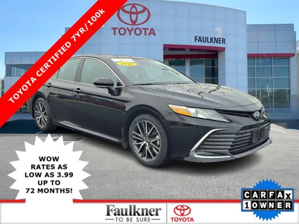 CARFAX One-Owner, Local Trade, Black w/Perforated Leather Seat Trim, 18" x 8J Alloy Wheels, 4-Wheel Disc Brakes, ABS brakes, Apple CarPlay/Android Auto, Auto High-beam Headlights, Auto-dimming Rear-View mirror, Automatic temperature control, Brake assist, Cold Weather Package, Dual front impact airbags, Dual front side impact airbags, Electronic Stability Control, Emergency communication system: Safety Connect (1-year trial), Exterior Parking Camera Rear, Four wheel independent suspension, Front dual zone A/C, Fully automatic headlights, Garage door transmitter: HomeLink, Heated door mirrors, Heated Steering Wheel, Illuminated entry, Knee airbag, Leather steering wheel, Multi-Stage Heated Front Bucket Seats, Navigation Package, Navigation System, Occupant sensing airbag, Outside temperature display, Overhead airbag, Perforated Leather Seat Trim, Power driver seat, Power passenger seat, Power steering, Radio: Premium Audio w/JBL, Rear side impact airbag, Speed control, Speed-sensing steering, Split folding rear seat, Steering wheel mounted audio controls, Telescoping steering wheel, Tilt steering wheel, Traction control. CARFAX One-Owner. Toyota Gold Certified Details:* Transferable Warranty* Roadside Assistance for 7 Year / 100,000 Mile. Standard New-Car Financing Rates Available. Warranty honored at over 1,400 Toyota dealers in the continental U.S. & Canada. Trade-ins accepted. Trouble-free handling of your transaction, including DMV paperwork* Roadside Assistance* Powertrain Limited Warranty: 84 Month/100,000 Mile (whichever comes first) from TCUV purchase date* 160 Point Inspection* Warranty Deductible: $0* Vehicle History* Limited Warranty: 12 Month/12,000 Mile Limited Comprehensive Warranty: 12 Month/12,000 Mile (whichever comes first) from certified purchase dateCertified.Midnight Black Metallic 2024 Toyota Camry XLE CERTIFIED FWD Automatic 2.5L I4 DOHC 16VRecent Arrival! 27/38 City/Highway MPG