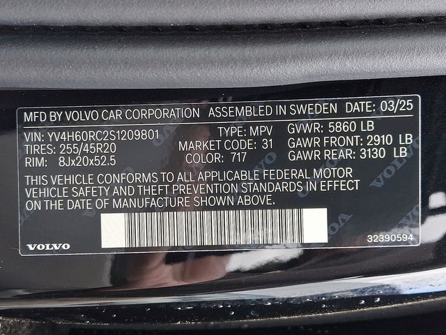 Onyx Black Metallic This XC60 Plug-In Hybrid T8 Plus is nicely equipped with Climate Package (Heated Rear Seats and Heated Steering Wheel), Protection Package Premier (All-Weather Floor Mats, Bumper Cover, Cargo Tray, First Aid Kit, and Wheel Locks), 11 Speakers, 4-Wheel Disc Brakes, ABS brakes, Air Conditioning, Alloy wheels, AM/FM radio: SiriusXM, Anti-whiplash front head restraints, Apple CarPlay, Auto High-beam Headlights, Auto-dimming door mirrors, Auto-dimming Rear-View mirror, Automatic temperature control, Brake assist, Bumpers: body-color, Delay-off headlights, Driver door bin, Driver vanity mirror, Dual front impact airbags, Dual front side impact airbags, Electronic Stability Control, Emergency communication system: Volvo Cars App w/4 Year Subscription, Exterior Parking Camera Rear, Four wheel independent suspension, Front anti-roll bar, Front Bucket Seats, Front Center Armrest, Front dual zone A/C, Front reading lights, Fully automatic headlights, Garage door transmitter: HomeLink, harman/kardon Premium Sound, Heated door mirrors, Heated Front Seats, Heated front seats, Illuminated entry, Knee airbag, Leather Shift Knob, Leatherette Upholstery, Low tire pressure warning, Luggage Cover, Memory seat, Occupant sensing airbag, Outside temperature display, Overhead airbag, Panic alarm, Passenger door bin, Passenger vanity mirror, Power door mirrors, Power driver seat, Power Liftgate, Power moonroof, Power passenger seat, Power steering, Power windows, Radio data system, Radio: High Performance Audio System, Rain sensing wipers, Rear anti-roll bar, Rear Camera Washer, Rear fog lights, Rear reading lights, Rear seat center armrest, Rear window defroster, Rear window wiper, Remote keyless entry, Security system, Speed control, Split folding rear seat, Spoiler, Steering wheel mounted audio controls, Tachometer, Telescoping steering wheel, Tilt steering wheel, Traction control, Trip computer, Turn signal indicator mirrors, Variably intermittent wipers, Wheels: 19" 5-Double Spoke Black Diamond Cut Alloy, and Wheels: 20" 6-Spoke Black Diamond Cut Alloy.