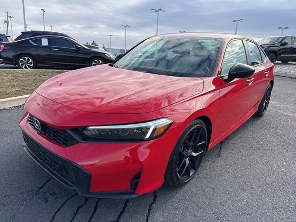 CARFAX One-Owner, Local Trade, Non-Smoker, Black w/Cloth/Leatherette Seating Surfaces, 4-Wheel Disc Brakes, ABS brakes, Adaptive Cruise Control: Adaptive Cruise Control (ACC) with Low-Speed Follow, Apple CarPlay/Android Auto, Automatic temperature control, Blind Spot Information (BSI) System warning, Brake assist, Cloth/Leatherette Seating Surfaces, Dual front impact airbags, Dual front side impact airbags, Electronic Stability Control, Emergency communication system: HondaLink, Exterior Parking Camera Rear, Four wheel independent suspension, Front anti-roll bar, Heated door mirrors, Knee airbag, Leather steering wheel, Low tire pressure warning, Occupant sensing airbag, Overhead airbag, Power door mirrors, Power steering, Radio: 180-Watt Audio System, Rear anti-roll bar, Rear side impact airbag, Speed control, Speed-sensing steering, Split folding rear seat, Steering wheel mounted audio controls, Telescoping steering wheel, Tilt steering wheel, Traction control, Wheels: 18" Gloss Black Alloy. CARFAX One-Owner.Rallye Red 2025 Honda Civic Sport FWD CVT 2.0L I4 DOHC 16VRecent Arrival! 31/39 City/Highway MPG